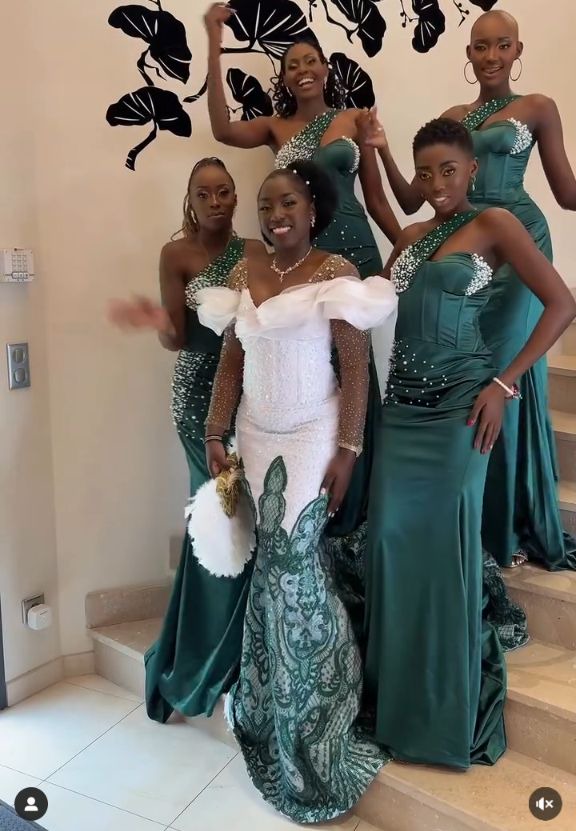 Standing proudly beside Fancy were her bridesmaids,dressed in matching deep emerald green gowns.