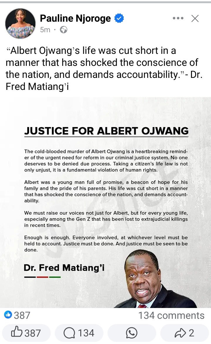 “The cold blooded murder of Albert Ojwang is heartbreaking reminder of urgent need for reform on our criminal justice system. No one deserves to be denied due process. Taking citizens life law is mot only unjust but funder mental violation of human rights.