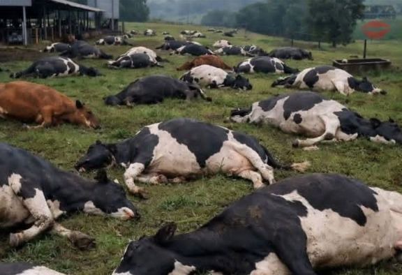 Through viral photos shared on social media showed many cows lying lifeless on the grass near a farm.
