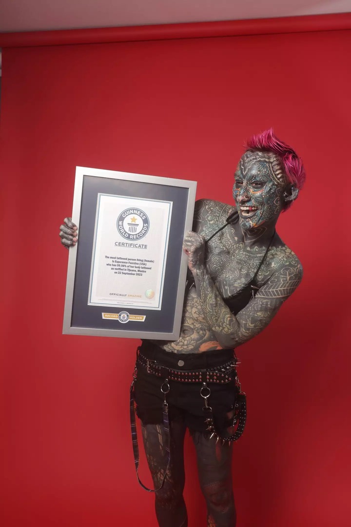 “To be the most tattooed woman and to have the most body modifications feels a little crazy, I am grateful and excited for the future – and of course I am not done,” she said of obtaining the Guinness World Records.